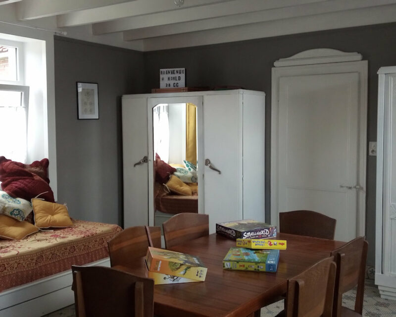 À l’intérieur, vous trouverez des chambres confortables pour tous les types de groupe : une chambre aux fauteuils roulants au RDC, des chambres familiales à l’étage, chacune avec leur salle de bain privé. Une grande salle à manger avec un bar au RDC et une grande salle de jeux avec la collection de pépite des jeux de société sélectionnés depuis 14 ans par Julie et Quentin dans leurs périples au Spiel d’Essen et à l’As d’Or de Cannes. Jeux géants, jeux fun, jeux d’initiés ou jeux familiaux, vous trouverez votre bonheur parmi la collection. Pour ceux qui comme nous, n’aiment pas découvrir un jeu en lisant une règle : nous pouvons vous expliquer la quasi totalité des règles de la collection que nous avons tous déjà testés, joués, et appris.